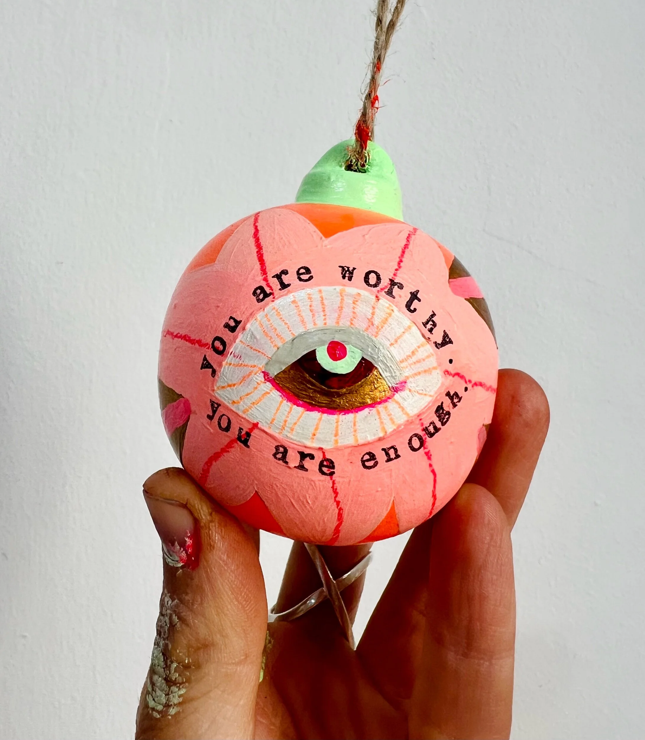 Shop › Bauble #7 Image 1 of 3 Image 2 of 3 Image 3 of 3 Bauble #7 $45.00 sold out You are worthy. You are enough.Acrylic and pencil on ceramic.one of a kind, lovingly handpainted.approx 6cm diameter Sold Out Added! You are worthy. You are enough.Acrylic and pencil on ceramic.one of a kind, lovingly handpainted.approx 6cm diameter