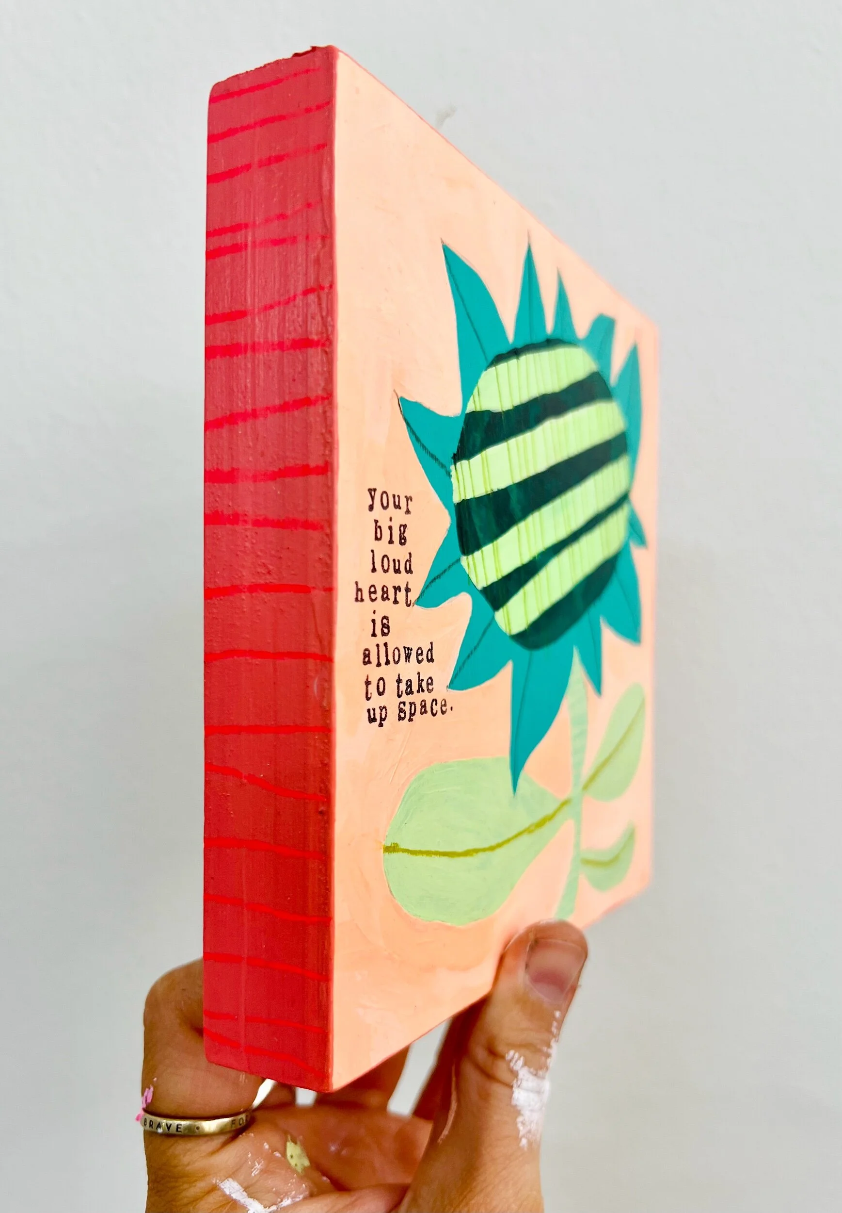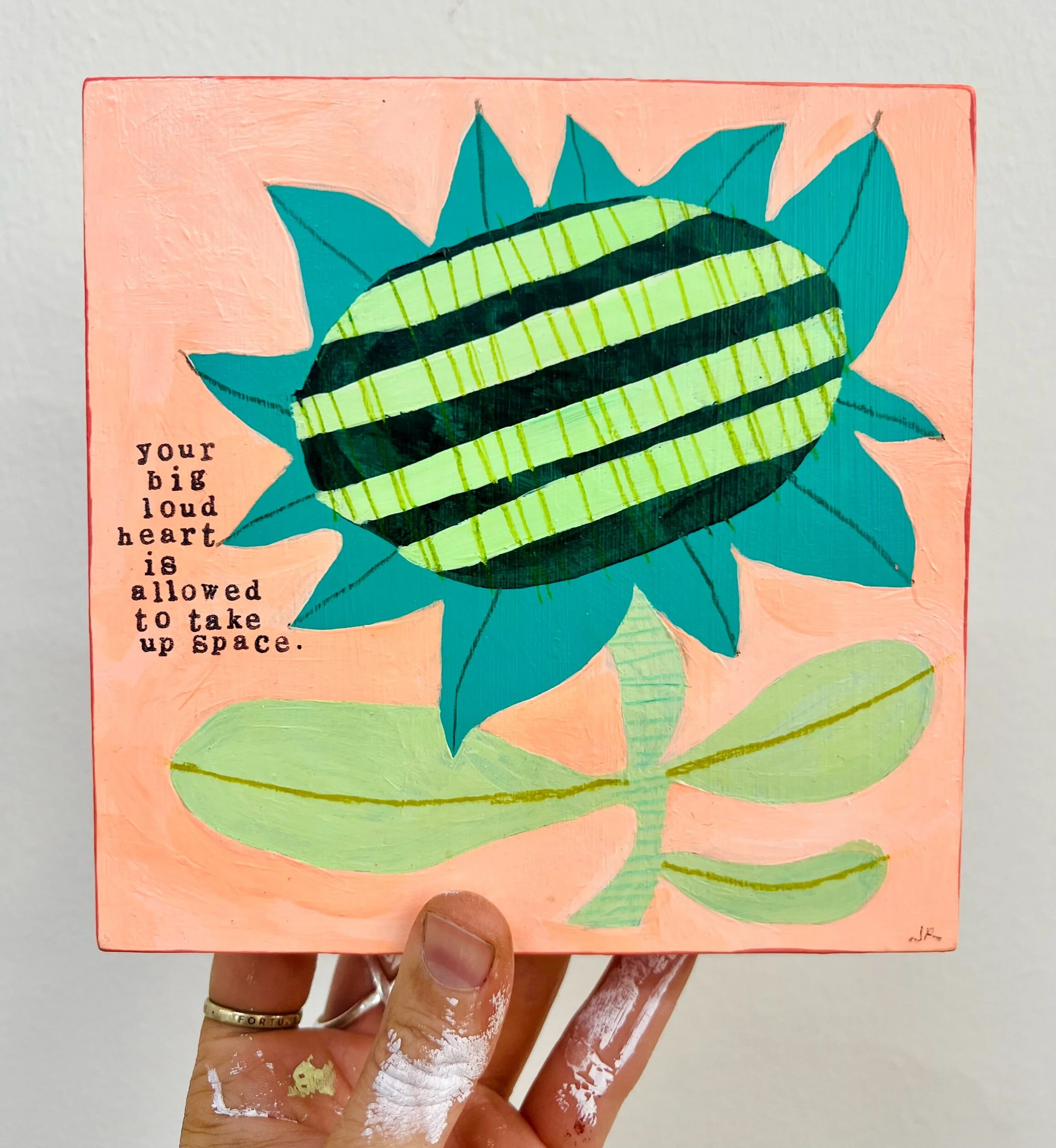 Shop › “your big loud heart is allowed to take up space” Image 1 of 2 Image 2 of 2 “your big loud heart is allowed to take up space” $110.00 sold out original painting on wooden boardAcrylic & pencil20 x 20cm Sold Out Added! original painting on wooden boardAcrylic & pencil20 x 20cm